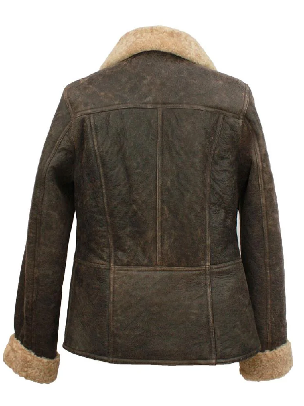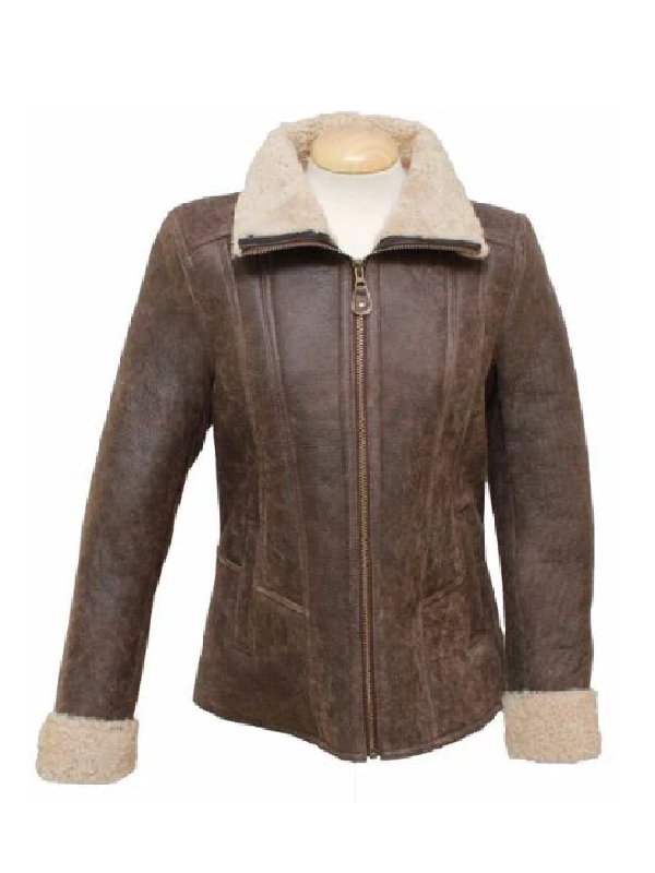 This chocolate brown aviator jacket is a practical but stylish women jacket with large zippered pockets that are both practical and stylish- perfect when carrying important items with you. The shearling-lined cuffs and hem do not only increase the insulation but also add the luxe look of the jacket.